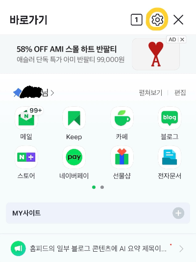 1. 네이버 앱 실행 후 톱니바퀴(설정) 아이콘을 터치
